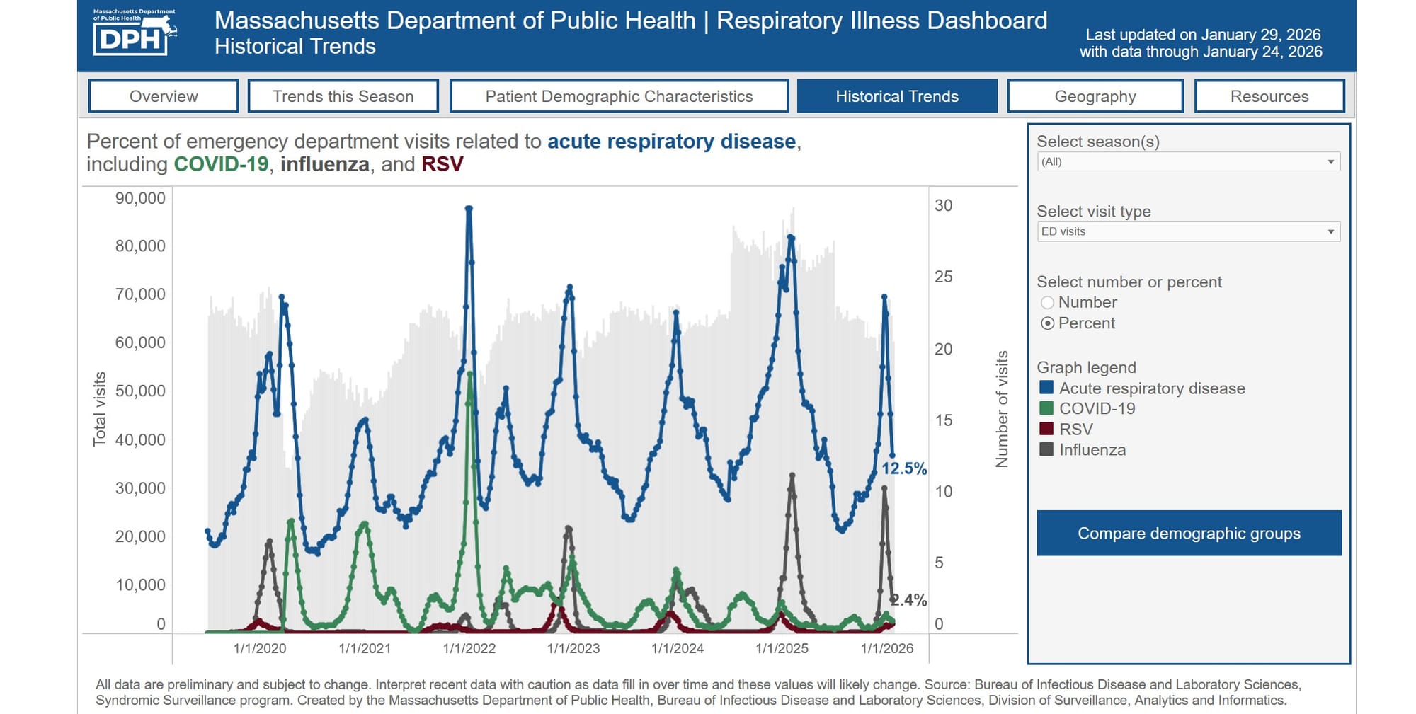 According to the Massachusetts Department of Public Health, the number of emergency room visits has dropped from the beginning of 2026 when they were at an all-time high. The latest numbers — from the week of Jan. 18 to Jan. 24 — saw an estimated 12.5% of visits focused on acute respiratory illness; .9% for COVID-19; 2.4% for influenza; and .7% for RSV.