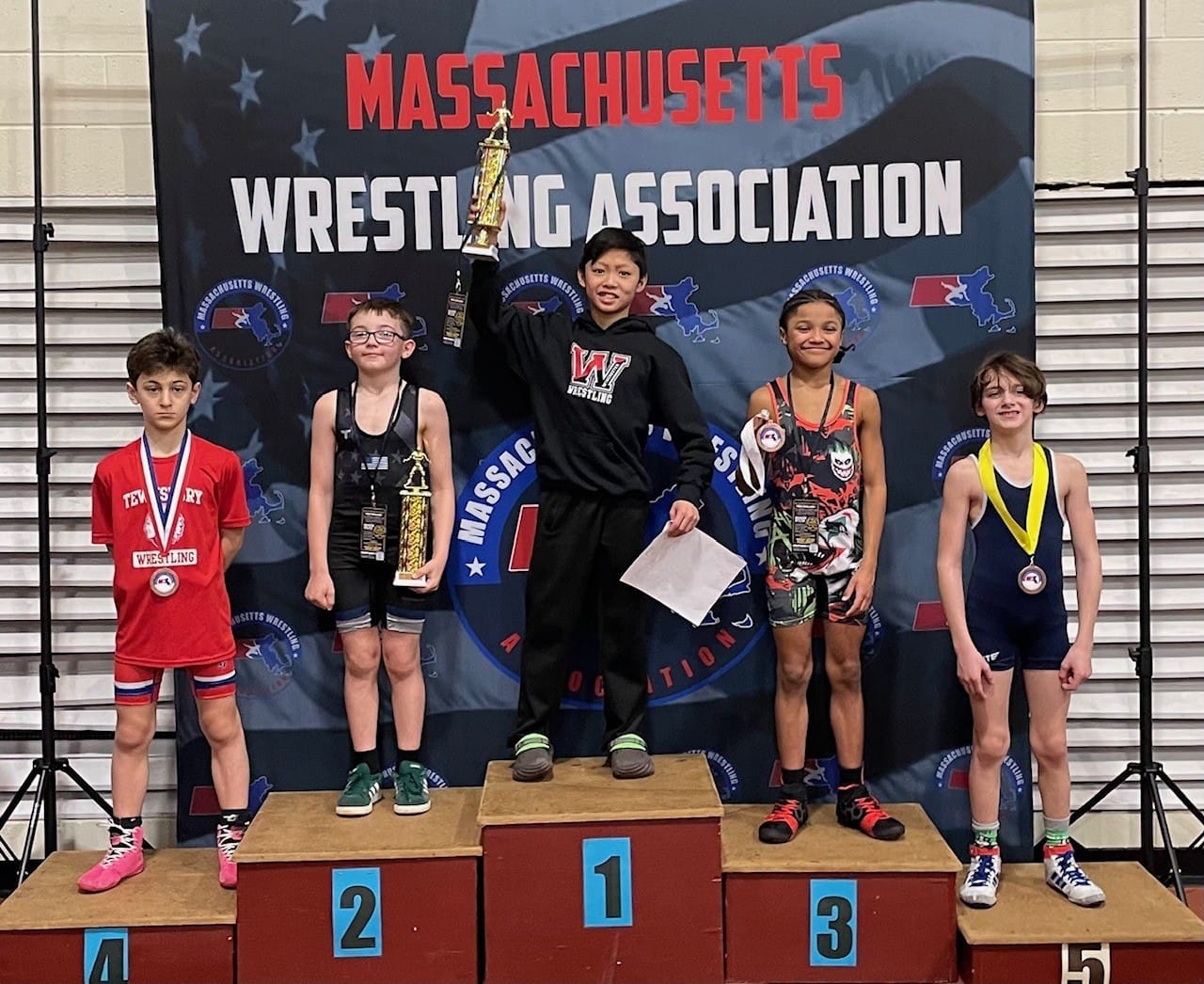 “Omar, Daniel and Robbie came up short of qualifying,” said coach Pulli, “while Dunavan, only a second-year wrestler, made it to the semifinals, before finishing fourth in the 67-pound weight class. But Alex then topped everybody to secure the U-12 state title at 74-pounds.”