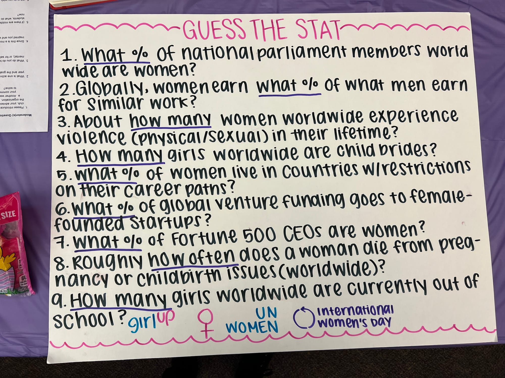 Girl Up hosted a “Guess the Statistic” game in which players were asked to estimate statistics related to female representation and the gender disparity. For example, participants learned that only around 27.5% of parliamentary members are women and that 125 million girls worldwide are currently out of school.
