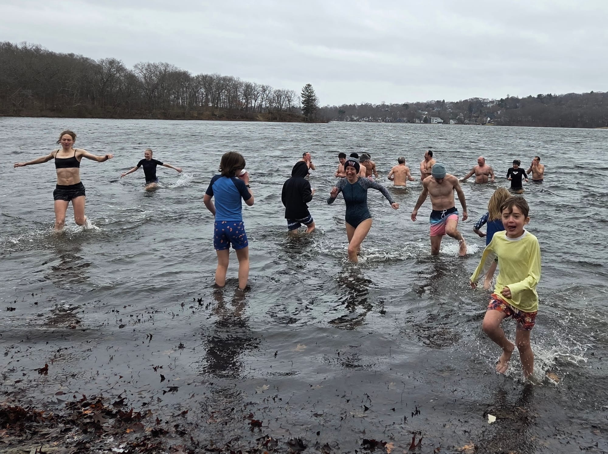 On Sunday, Chris Crowell and several youngsters used rakes to clear leaves from the water’s edge. Someone arrived with coffee and donuts while others worked the registration table, took photos, or greeted people as they came down the steps to the beach. There were polar bear temporary tattoos and Swim Winchester magnets.