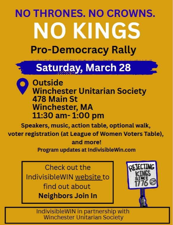IndivisibleWIN, the Winchester chapter of the nationwide pro-democracy movement Indivisible, is organizing this rally. This weekend, it will add “The Neighbors Join In” and action tables.