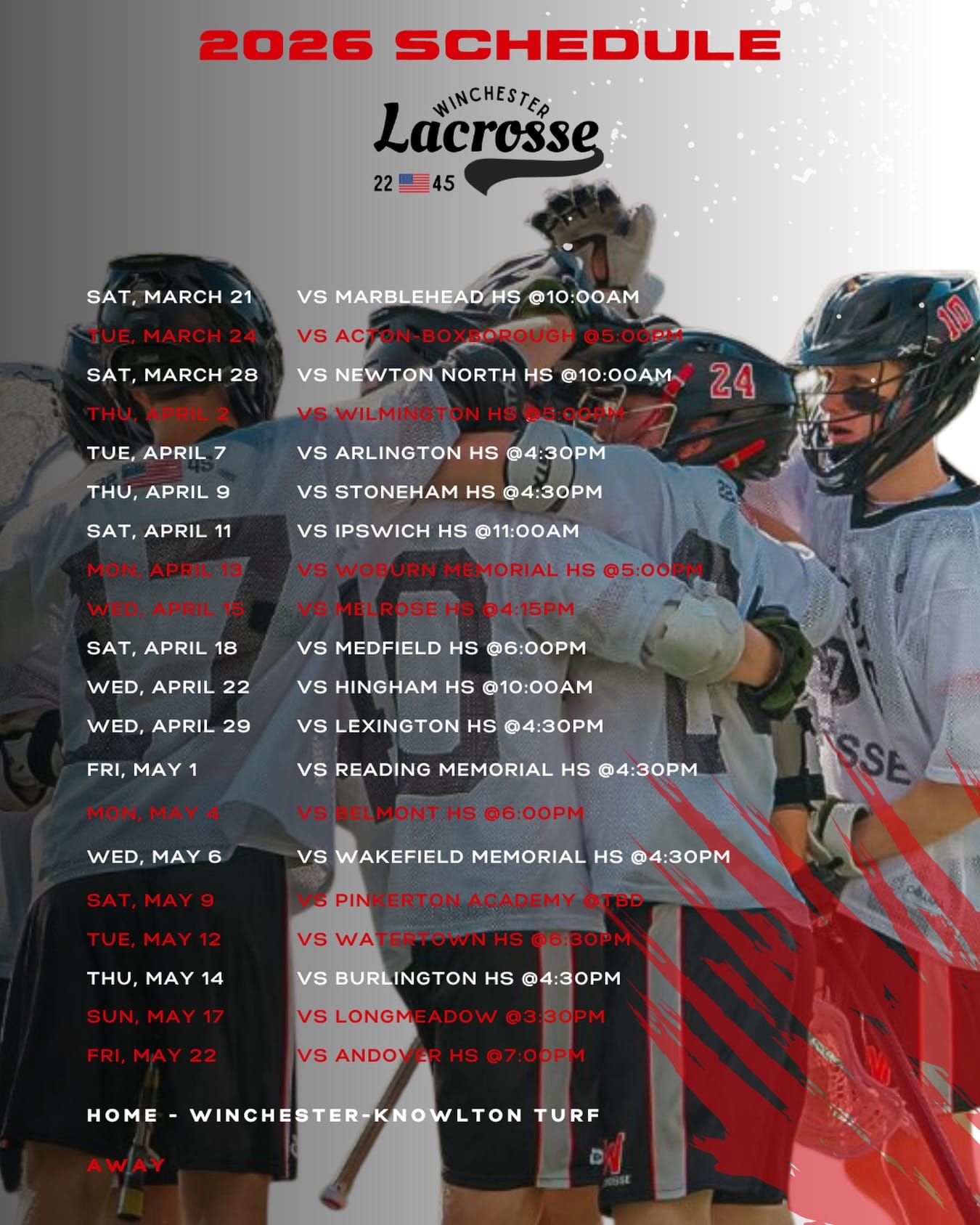 Ryan Martin, Ted Budreski, Oliver Goldberg, Gianni Deprimeo and Cooper Spence are the Red & Black’s 2026 captains, and after two preseason scrimmages against Marblehead (March 21) and Acton-Boxborough (March 24) these five senior leaders and their teammates are scheduled to begin the regular season against non-league Newton North in the home opener on Saturday, March 28, at 10 a.m. They will be at Wilmington to face the Wildcats on April 2 at 5 p.m.