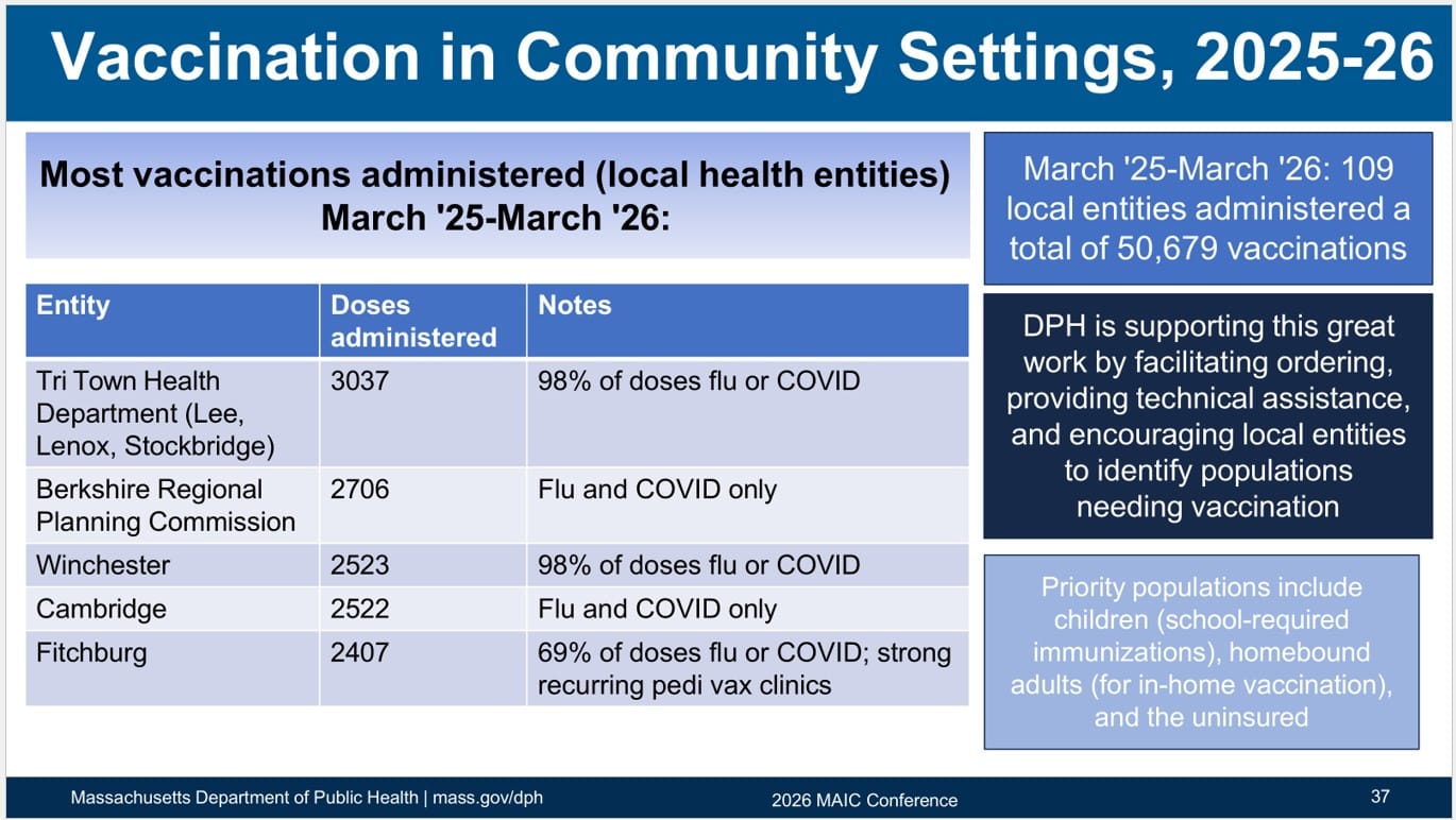 During the presentation by DPH Director of the Immunization Division Pejman Talebian, a slide was shown and highlighted. The slide shows that the Winchester Health Department was ranked third in the state for the most vaccines administered for the past year.