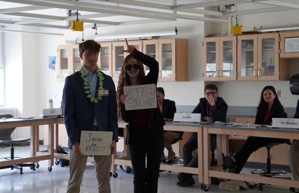 Left, In the Ad-hoc Stranger Things Committee, an election was held between Jason Carver and Lucas Sinclair (represented by Chair Sierra Scott), with Sinclair emerging as the winner while Talia Ho and Diya Patlolla worked hard at Washington’s Cabinet Dais. COURTESY PHOTOS/ELIANA DAI-ZHOU