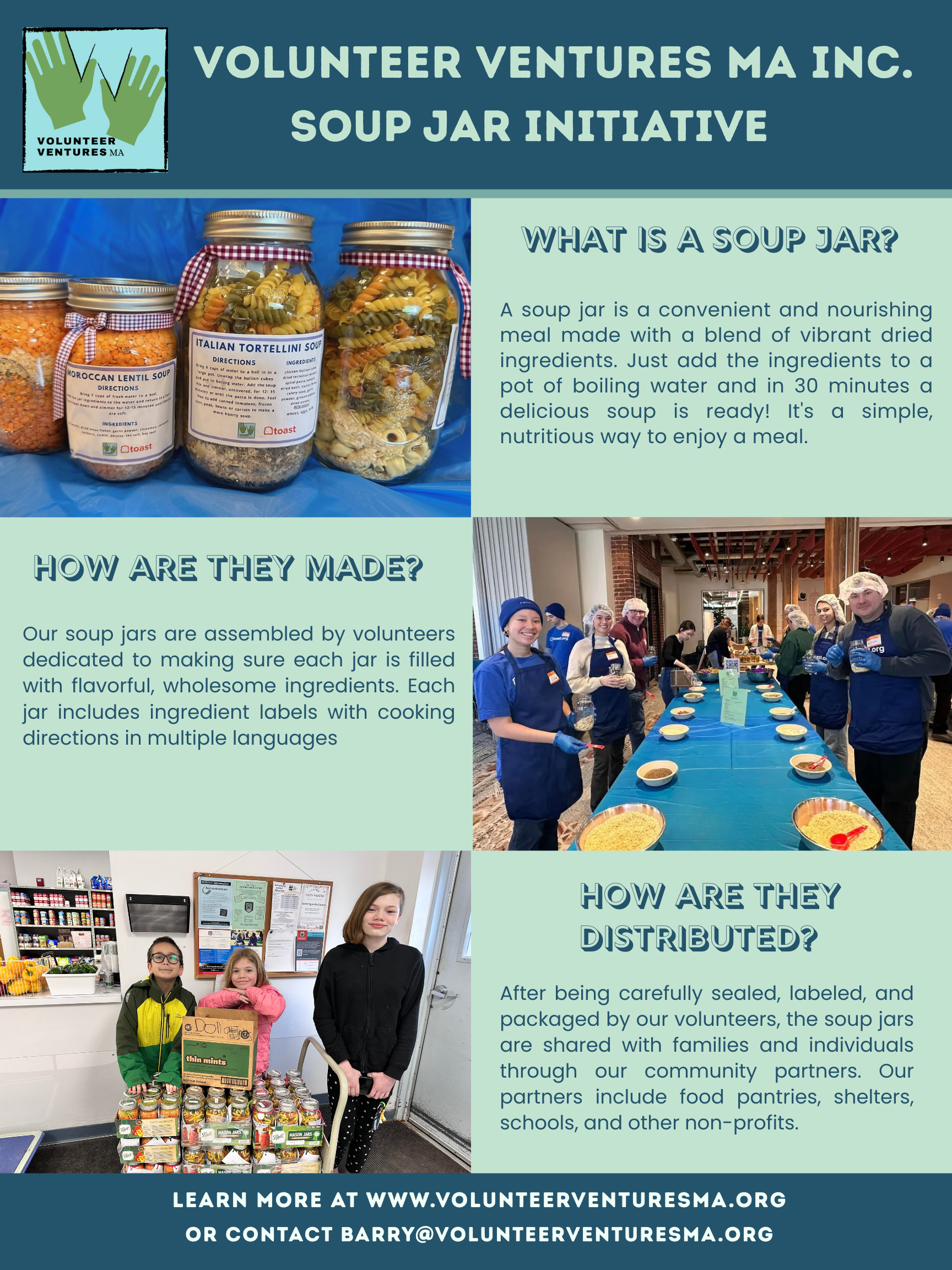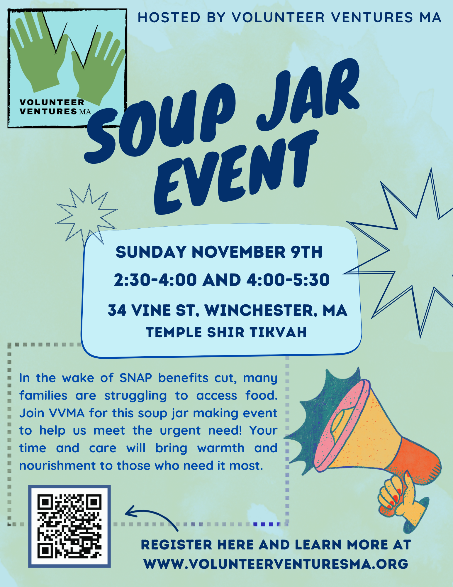 This Sunday, Volunteer Ventures MA will be hosting an emergency Soup Jar-Making event at Temple Shir Tikvah in Winchester to assist our neighbors living with food insecurity in these particularly challenging times.